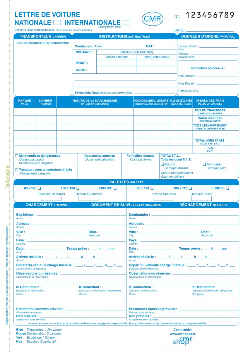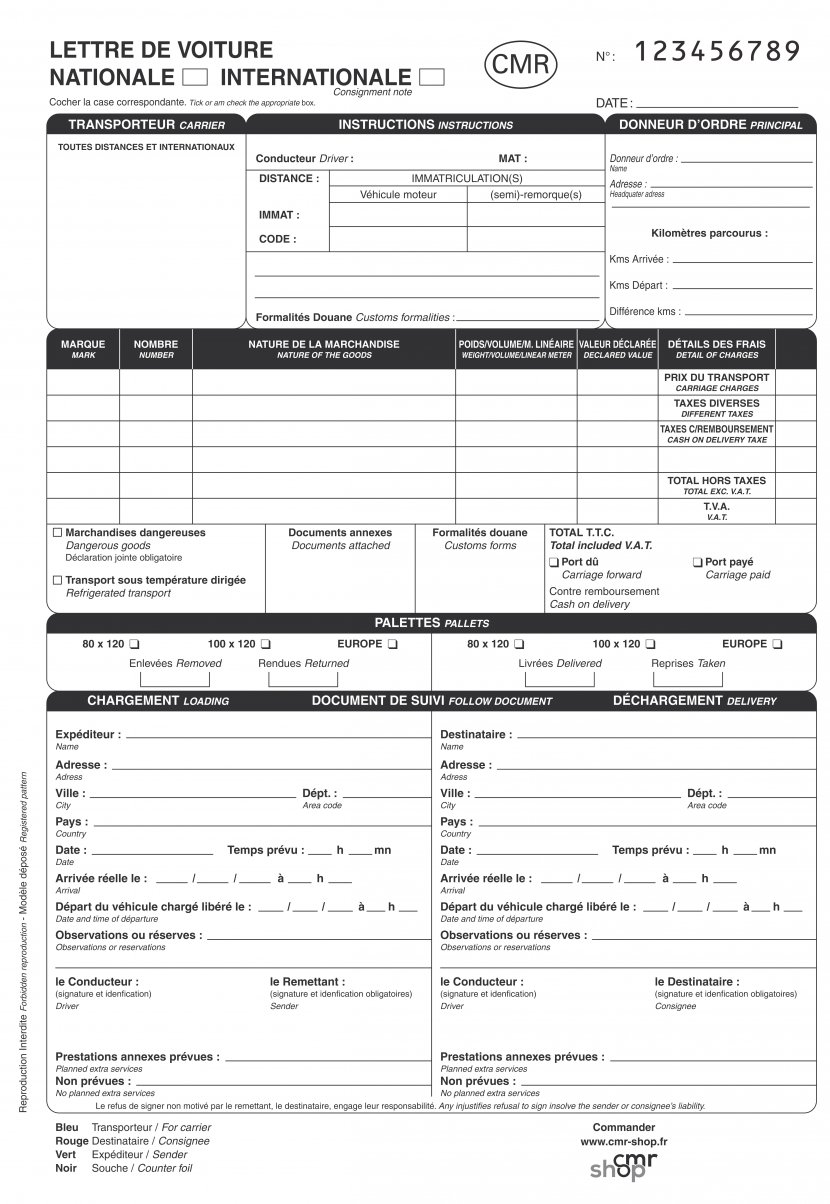 Lettre de voiture ou CMR. A partir de € 3,30 par carnet.